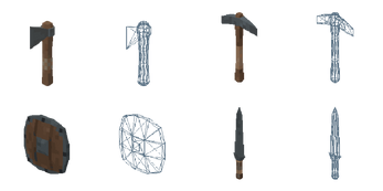 Contains five models: Axe, Pickaxe, Shield, Sword, Barrel.